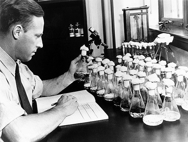 The antibiotic era begins as penicillin's broad-spectrum effectiveness and scalable mass production overshadow phage therapy in the West.